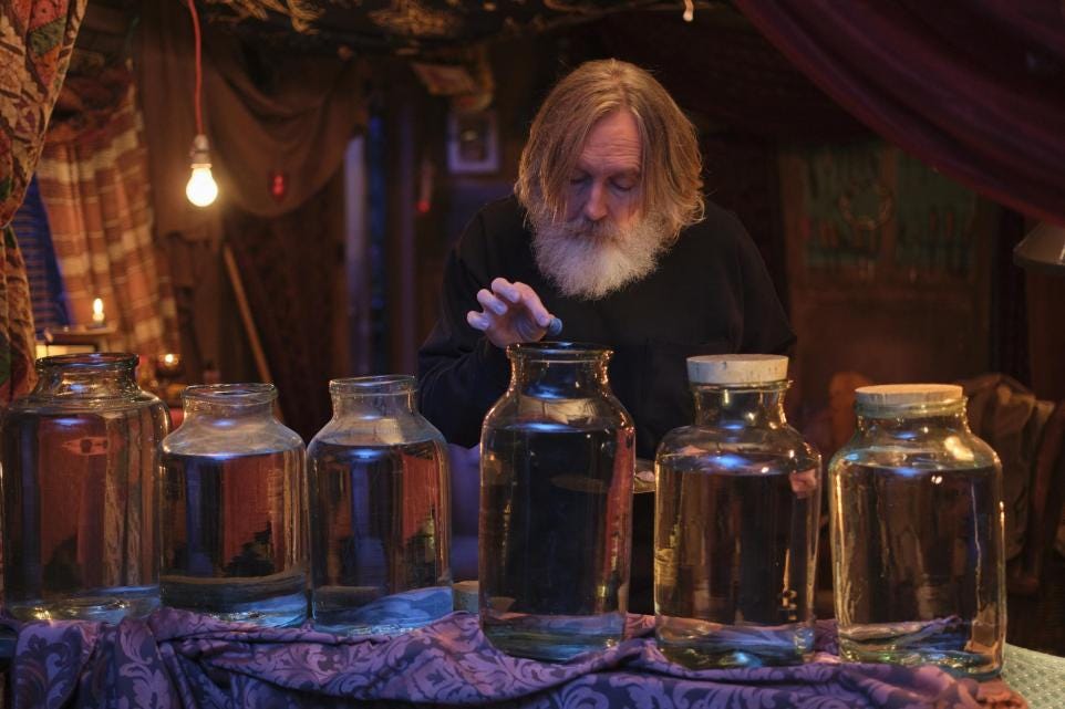 The Dad is in a care home and is played with such touching skill by Michael Palin. Years ago, when Dad was doing National Service in Egypt, he learnt how to create or summon up homunculi in water-jars. These funny little creatures will, when sufficiently mature, be able to foretell the future. If only Michael can make some homunculi, and cherish them, in the secrecy of his shed, he might be able to get them to tell him the truth about his missing girlfriend.